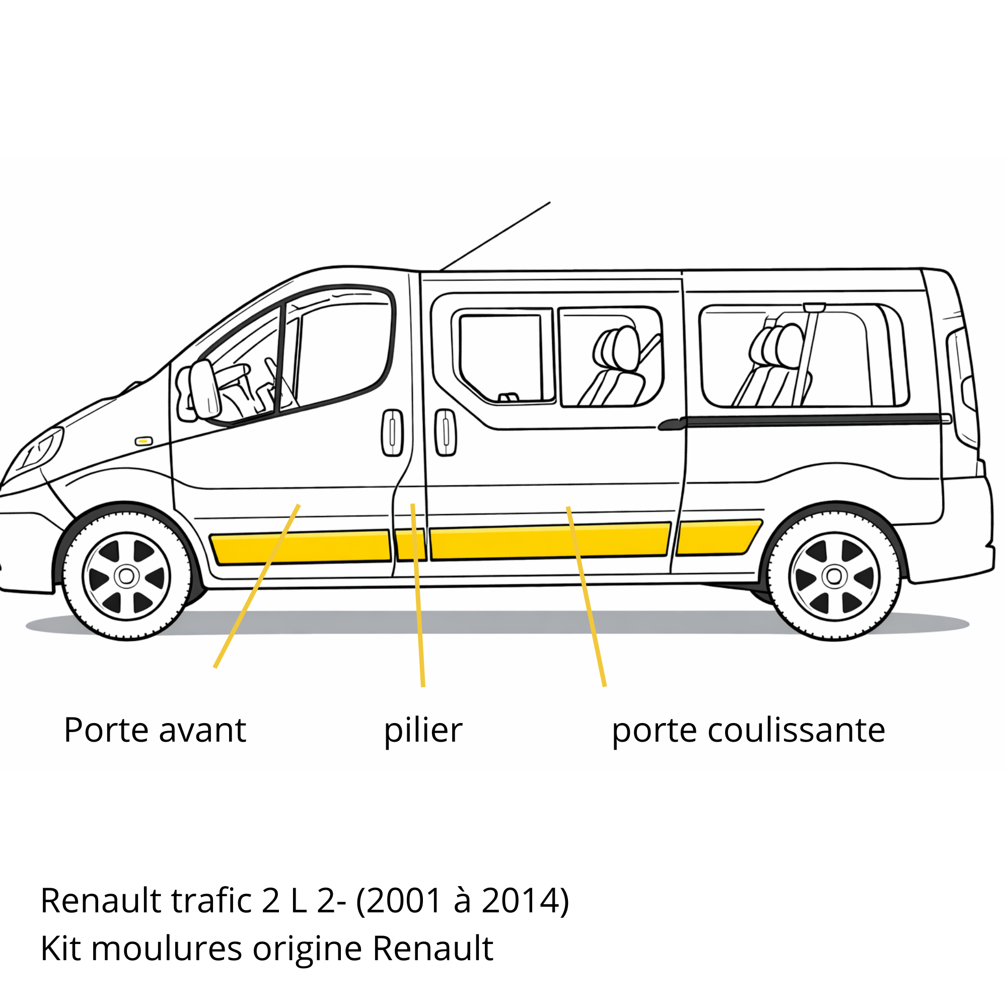 Kit moulures Renault Trafic 2 L2 origine Renault, destiné exclusivement aux versions L2 (modèle long) produites entre 2001 et 2014.